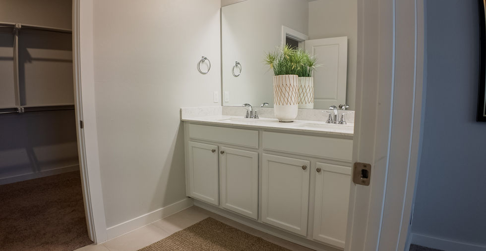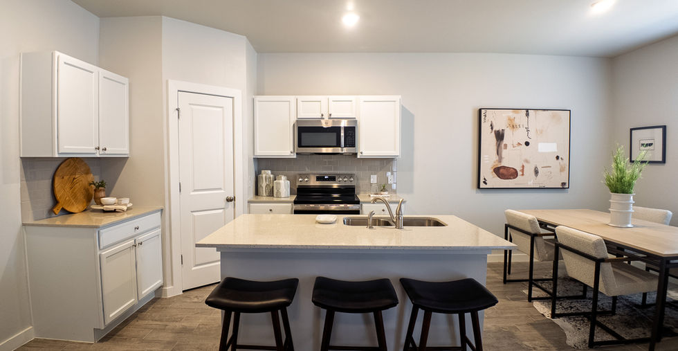 The open-concept Bismark layout features stylish wood-look tile flooring throughout, creating a warm and inviting atmosphere. The kitchen boasts white cabinets, stainless steel appliances, a pantry, and a tiled backsplash. The primary suite…